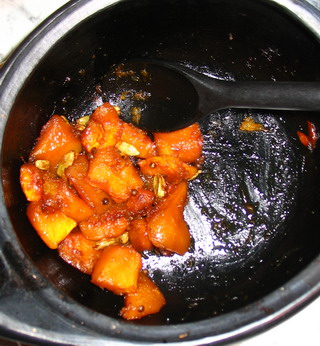 lid on. Into a medium oven. Check and stir once in a while. When the squash is mostly cooked, uncover and turn up the oven to get the liquid to evaporate.